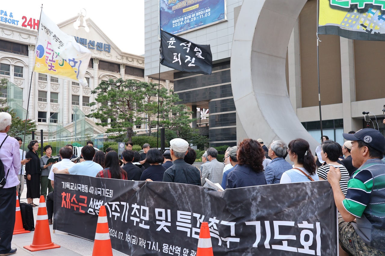 기독교시국행동(아래 시국행동)은 19일 오후 7시 용산역 앞 광장에서 '채수근 상병 1주기 추모 및 특검 촉구를 위한 기도회'를 개최해 고 채 상병의 안식을 기원하며, 용산 대통령실 앞까지 진상규명을 위한 특검을 시행할 것을 외치며 행진했다.