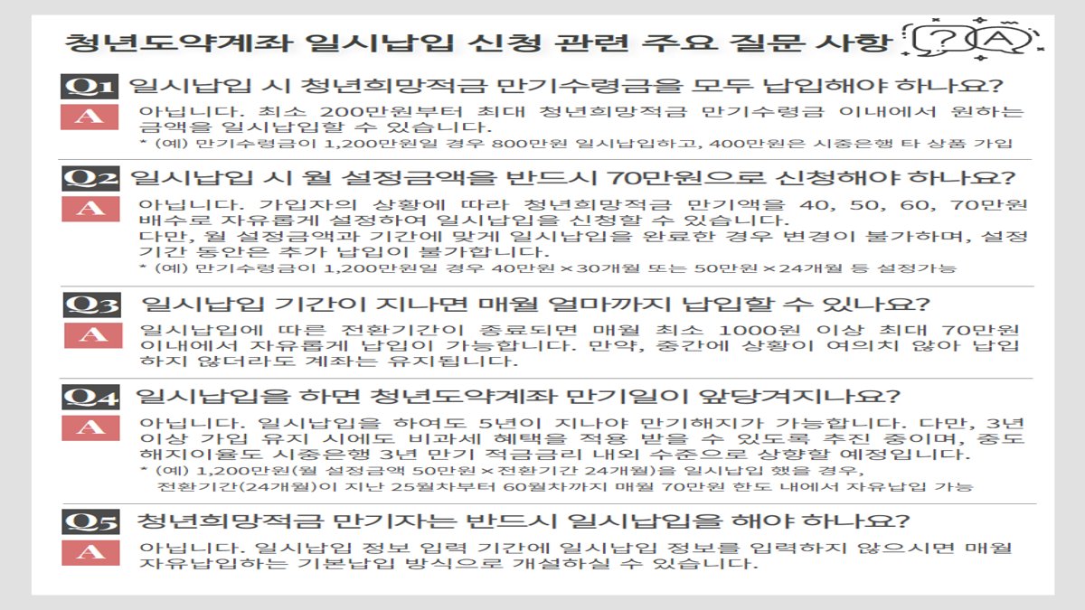 이러한 청년도약계좌의 일시납입 시스템은 청년들이 자산을 형성하고 재정적 도약을 이룰 수 있는 효율적이고 실질적인 방법을 제공합니다. 세심하게 설계된 이 시스템을 통해, 청년들은 자신의 재정 상황과 목표에 맞춰 최적화된 금융 계획을 수립할 수 있으며, 궁극적으로는 보다 안정적이고 풍요로운 미래를 구축하는 데 큰 도움을 받을 수 있습니다.