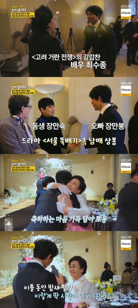 연예계 대표 사랑꾼이자 최근 인기리에 종영한 드라마 '고려 거란 전쟁'의 주역, 배우 최수종이 등장해 반가운 인사를 나눴다. 박원숙은 '같이 삽시다' 출연을 제안하기도. 이어 최수종은 이틀 밤샘 촬영 후 결혼식에 참석했다며 혜은이와의 의리를 뽐냈다.