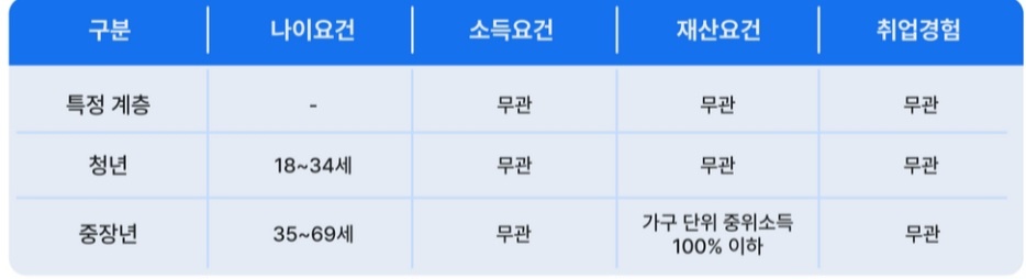 2 유형은 1 유형에 해당하지 않는 특정 계층과 청년, 중장년층이 해당되는데요. 특정 계층과 청년은 나이 요건만 충족하면 소득, 재산, 취업 경험 모두 상관없이 지원 가능하며, 중장년층은 나이와 소득 요건을 충족하면 됩니다.