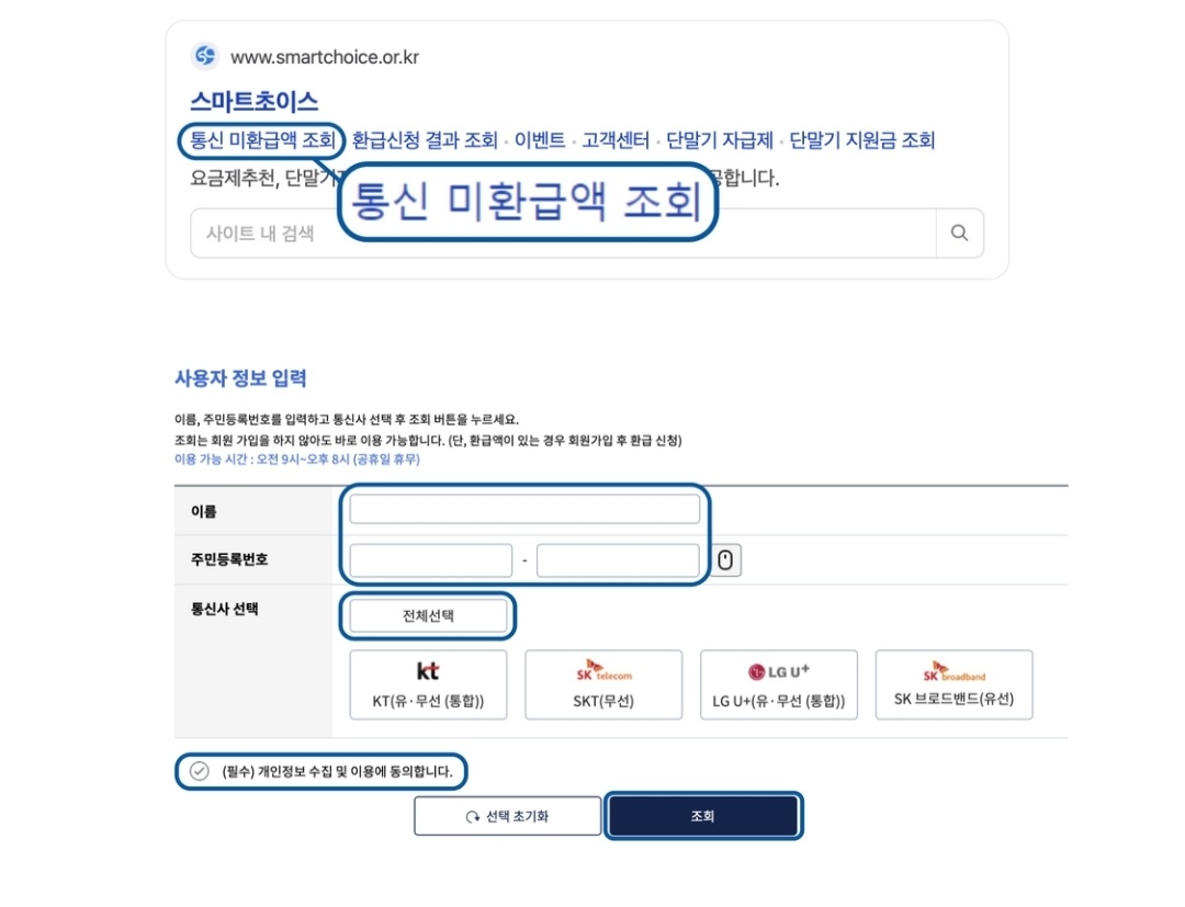 ※ 통신사별 미환급 통신료 문의도 스마트 초이스와 마찬가지로 평일에만 이용 가능합니다 ( 09:00~20:00 )
