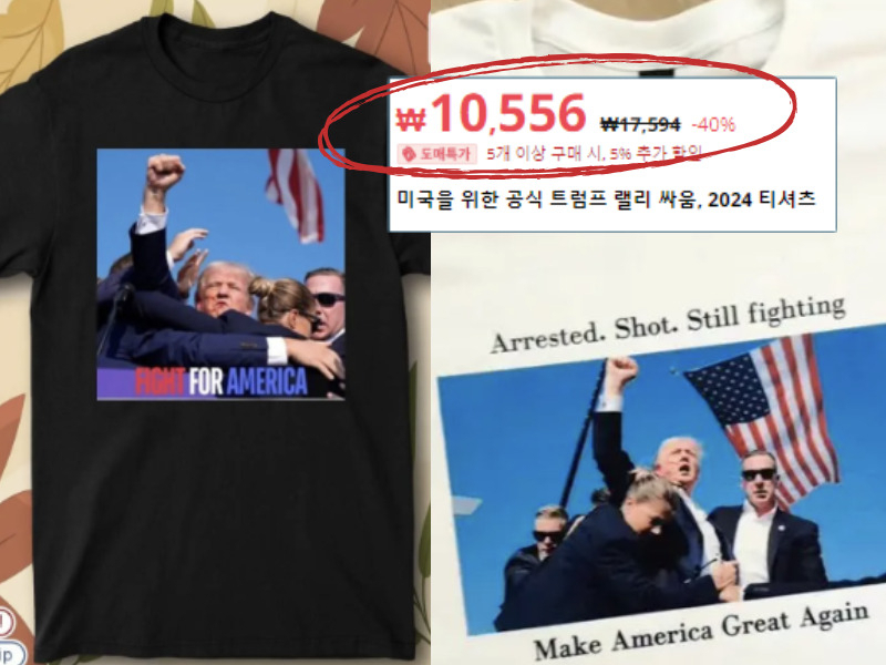 트럼프 전 대통령 피격 현장 사진이 인쇄된 티셔츠다. 해당 사진은 세계적 통신사 AP 소속의 20년 차 사진기자 에번 부치가 촬영한 사진이다. 하루도 되지 않아 판매됐다는 점에서 사진 저작권 논란도 제기될 수 있다.