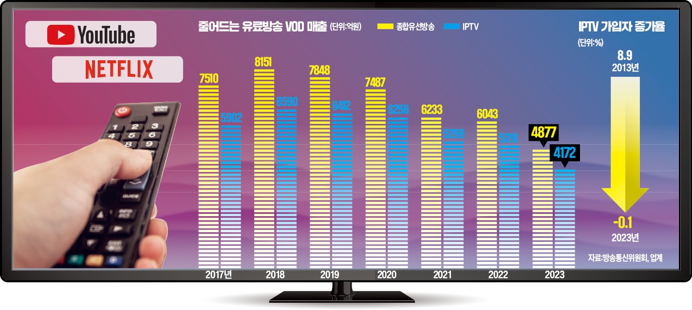 지난해 IPTV VOD 매출은 4721억원으로 2022년보다 20% 줄었다. 종합유선방송 VOD 매출도 같은 기간 19.3% 감소한 4877억원에 그쳤다. 둘 다 최근 10년을 통틀어 가장 적은 수준이다. 올해 상반기에 이 현상이 더 강해진 것으로 잠정 집계됐다.