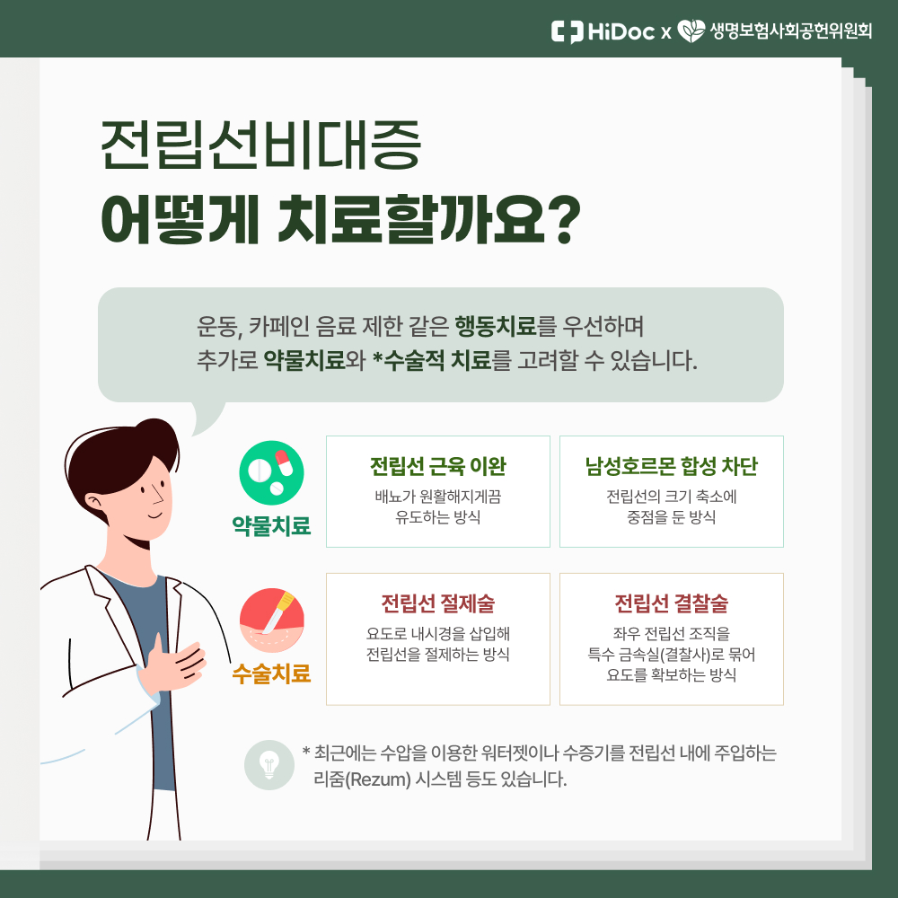 전립선비대증의 치료는 운동이나 카페인 제한과 같은 생활습관의 개선을 우선한다. 이후에도 증상이 호전되지 않는 경우 수술적 치료 방법을 고려해 볼 수 있다. 전립선비대증의 증상과 치료 및 예방법, 그리고 보험 적용 기준까지. 전립선 비대증에 대해 샅샅이 알아보자.