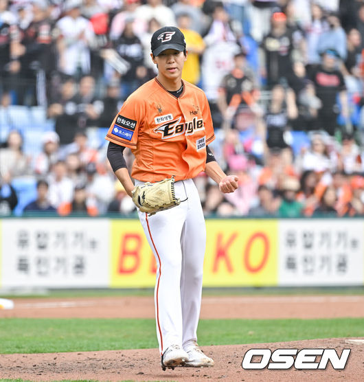 [OSEN=대전, 박준형 기자] 31일 오후 대전한화생명이글스파크에서 ‘2024 신한 SOL BANK KBO리그’ 한화 이글스와 KT 위즈의 경기가 진행됐다. 이날 한화는 황준서를 ,KT 벤자민을 선발투수로 내세웠다. 3회초 한화 선발투수 황준서가 실점 위기 넘긴후 기뻐하고 있다. 2024.03.31 / soul1014@osen.co.kr