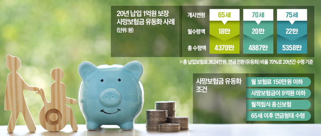 1억원짜리 사망보험금 중 70%를 연금으로 전환하면 20년간 매월 20만원 안팎의 연금을 수령할 수 있다.