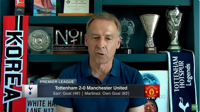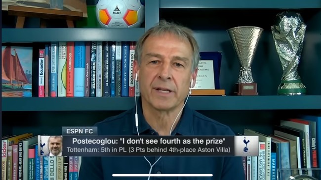 'ESPN'은 22일(이하 한국시간) 클린스만이 패널로 나온 영상을 게시했다. 클린스만은 엔제 포스테코글루 감독의 토트넘 훗스퍼가 프리미어리그 4위에 도전하는 걸 이야기했다. 또 아스널, 바이에른 뮌헨이 유럽축구연맹(UEFA) 챔피언스리그(UCL) 8강에서 만나는 걸 두고 전망하기도 했다.