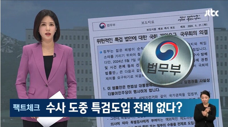JTBC는 특검법이 지금 수사를 하고 있는 공수처의 존재 이유를 부정하는 것이라는 정진석 비서실장과 법무부 논리를 두고 “공수처의 반대에도 이종섭 전 국방부 장관에 대한 출국금지 조치를 풀어주기도 했다”며 되레 법무부가 공수처 수사에 협조하지 않았다는 반대 논거를 제시했다.